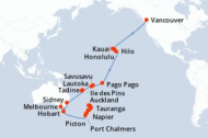 SYDNEY (Australia), Navegación -2 días-, MARE (Nueva Caledonia), ISLA DE LOS PINOS (Nueva Caledonia), Navegación, LAUTOKA, Navegación -2 días-, SUVA SUVA, PAGO PAGO (Samoa Americana), Navegación -5 días-, HILO (Hawaii), HONOLULU (Hawaii) -2 días-, KAUAI (Nawiliwili Hawaii), Navegación -6 días-, VANCOUVER (Canadá)