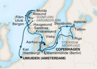 IJMUIDEN (Amsterdam), Navegación, HARDANGERFJORD (Cruise), ULVIK, SOGNEFJORD (Cruising), MOLDE (Noruega), FLAM (Noruega), ALESUND (Noruega), BERGEN (Noruega), HAUGESUND (Noruega), Navegación, KRISTIANSAND (Noruega), AARHUS (Dinamarca), COPENHAGUE, Navegación, VISBY (Suecia), RIGA (Letonia), TALLÍN (Estonia), HELSINKI (Finlandia), Navegación, ESTOCOLMO (Suecia), Navegación, WARNEMUNDE (Rostock), CANAL DE KIEL (Navegación, COPENHAGUE