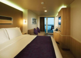 MiniSuite exterior con balcón privado, accesible a traves de dos puertas de cristal de suelo a techo, con dos camas bajas con colchón de calidad superior convertibles en cama de matrimonio, con un suave cabecero de cuero suave y almohadillado para poder estar más cómodo cuando leas en la cama. Huecos iluminados sobre la cama donde poder colocar tus cosas, tus libros, tu tablet, revistas, e-readers o tu portátil. Zona de estar con toques modernos como la iluminación LED en el perímetro del techo que da una calidez extraordinaria al ambiente, con sofá-cama, en algunas cabinas con camas altas retraibles -tipo litera-para 3º y 4º pasajero, escritorio-tocador con silla, cafetera, estanterías, y cajones para poner tus pertenencias con comodidad, armario completo con puertas correderas. Baño privado con mobiliario de madera, más cálido y refinado, con dos lavamanos con dos grifos completos decorado con mosaico de cristal, con ducha de spa con cabezal especial a presión y con cascada de agua y chorros múltiples o cabezal de ducha manual, secador de pelo, aire acondicionado regulable, TV interactiva de pantalla plana con programación vía satélite, teléfono y caja fuerte. Aprox. 19 m² de cabina y 3 m² de balcón.