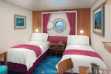 Camarote doble exterior ventana fija redonda (tipo ojo de buey) con luz natural y vistas al mar, con dos camas bajas convertibles en cama de matrimonio, con zona de estar con sofá, con baño privado con ducha y secador de pelo, aire acondicionado, tocador con silla, TV interactiva, Teléfono, caja fuerte y armario empotrado. 15 m² de Cabina.