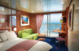 Camarote doble exterior con balcón privado con vistas a la popa del barco, con puertas correderas de cristal de suelo a techo, con vistas al mar, con dos camas bajas convertibles en cama de matrimonio, con zona de estar con sofá, con baño privado con ducha y secador de pelo, aire acondicionado, tocador con silla, TV interactiva, Teléfono, caja fuerte y armario empotrado. 16 m² de Cabina y 3 m² de Balcón