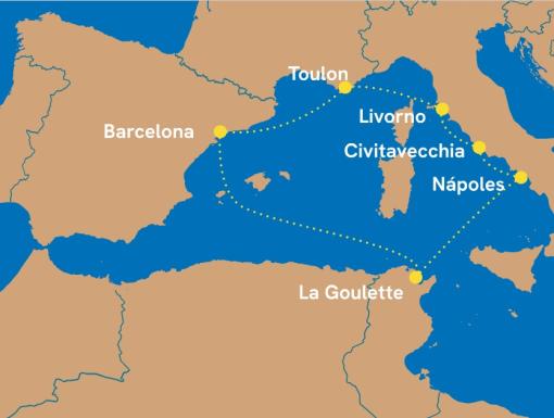 BARCELONA (España), TOLÓN -Costa Azul- (Francia), LIVORNO -Florencia y Pisa- (Italia), CIVITAVECCHIA -Roma- (Italia), NÁPOLES -Pompeya- (Italia), LA GOULETTE (Túnez), Navegación, BARCELONA (España)