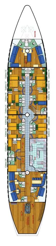 Las cabinas de pasajeros ocupan la mayor parte de la cubierta Tween. Los camarotes de la tripulación, los camarotes de acompañantes para la tripulación y la cocina también se encuentran en la cubierta intermedia.