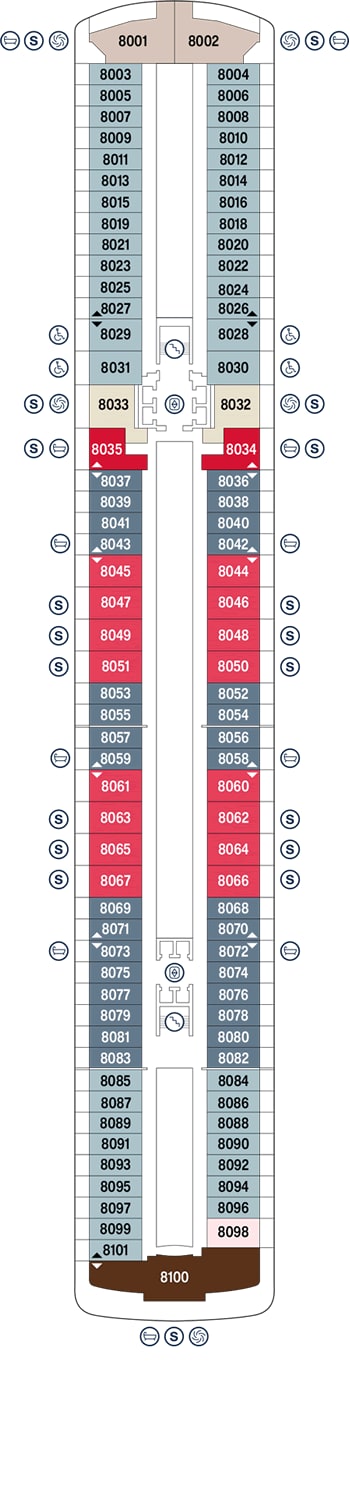 Ubicada en Proa, la icónica Suite Owner´s Residence ofrece el alojamiento más amplio y exclusivo a bordo, con diferentes espacios de gran elegancia en los que disfrutar al máximo de su estancia a bordo. Sus luminosos ventanales de suelo a techo dejan entrar la luz a raudales, y dan acceso a una inmensa terraza con jacuzzi, hamacas, mesa de comedor desde donde deleitarnos de relajantes vistas al mar y al cambiante paisaje. Las suites disponen de una sala de estar independiente con un confortable sofá, comedor independiente con mesa para seis comensales, TV interactiva, un minibar, máquina de café o té, mesita de cortesía. El dormitorio independiente ofrece cama de matrimonio, luces de lectura en la cama, cargadores USB, amplio vestidor con tocador, lujoso baño de mármol con dos lavabos, bañera y ducha separada, baño de vapor. Servicio de mayordomo. Aprox. Suite: 155 m², Terraza: 125 m²